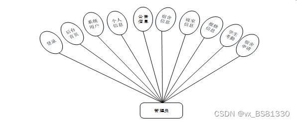 (1)管理员模块:系统中的核心用户是系统管理员,管理员登录后,通过管理员菜单来管理系统。主要功能有:后台首页、系统用户(管理员、学生用户、教师用户)模块管理(公告信息、宿舍信息、寝室信息、报修信息、学生考勤、宿舍申请)个人信息等功能。管理员用例图如图3-1所示。