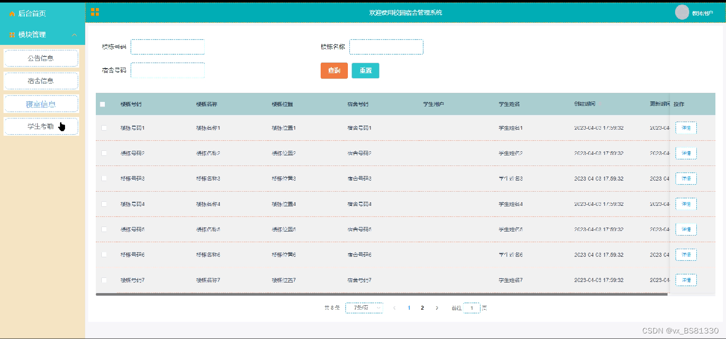 The campus dormitory management system includes personal information management, system user management, dormitory information management, dormitory information management, announcement information management, repair information management, student attendance management, dormitory application management, and other business functions. The campus dormitory management system adopts Python language technology, Django framework, and is developed based on MySQL. Implemented, this system has good compatibility and adaptability, providing users with more campus dormitory management information and a good platform, thereby improving the core competitiveness of the system.