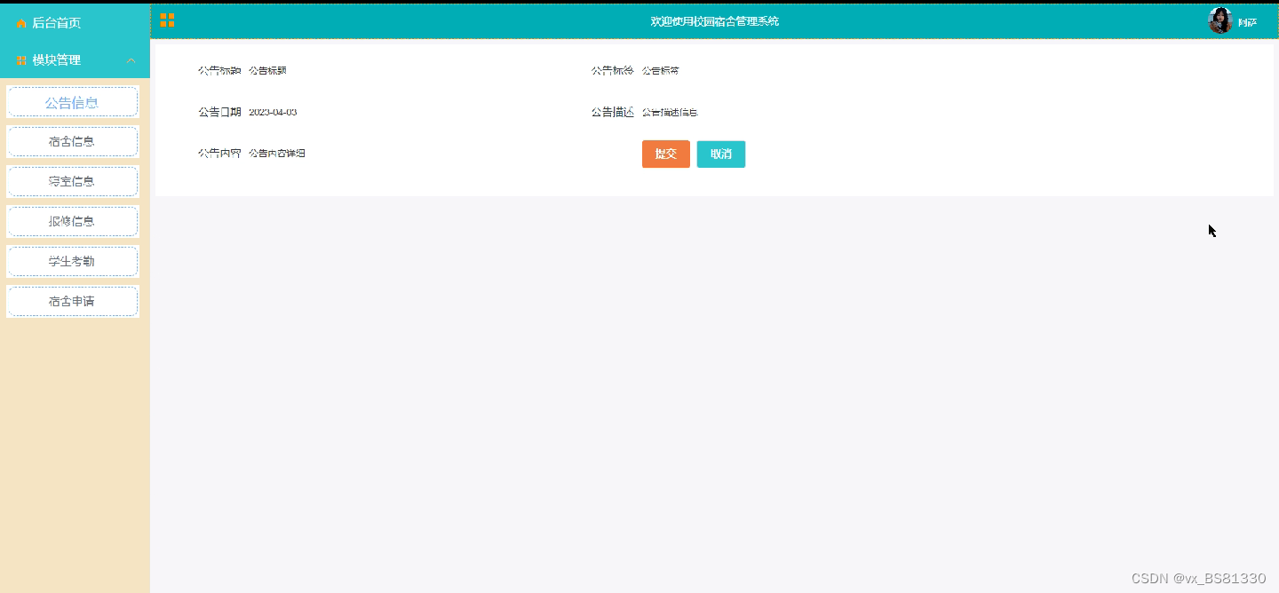 公告信息,在校园公告页面中可以查看管理员发布的公告信息,如:公告标题、公告标签、公告日期、公告内容、公告描述等信息。如图5-13所示。
