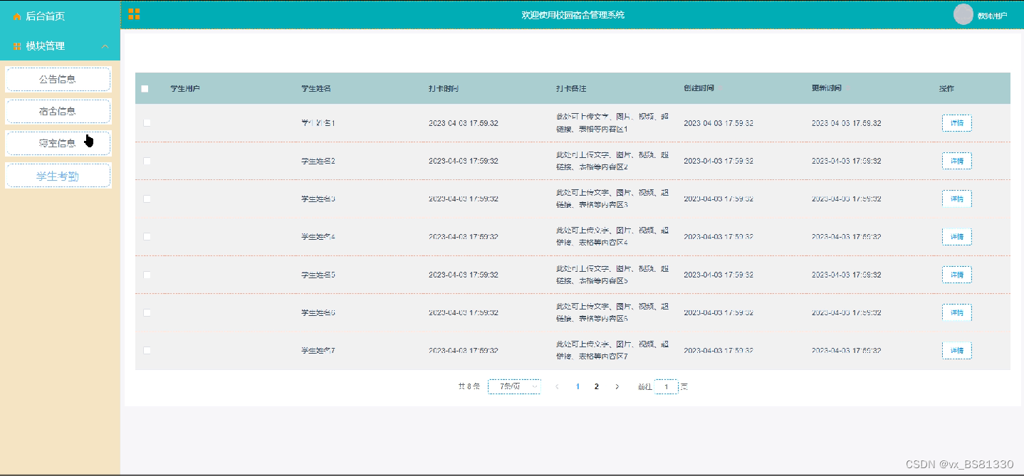 校园宿舍管理系统包含了个人信息管理、系统用户管理、宿舍信息管理、寝室信息管理、公告信息管理、报修信息管理、学生考勤管理、宿舍申请管理等等业务功能,校园宿舍管理系统采用python语言技术,Django框架,基于MySQL开发。实现了,本系统具有良好的兼容性和适应性,为用户提供更多的校园宿舍管理信息,也提供了良好的平台,从而提高系统的核心竞争力。