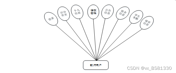 (3)教师用户:后台首页、模块管理(公告信息、宿舍信息、寝室信息、学生考勤)个人信息等功能。教师用户用例图如图3-3所示。