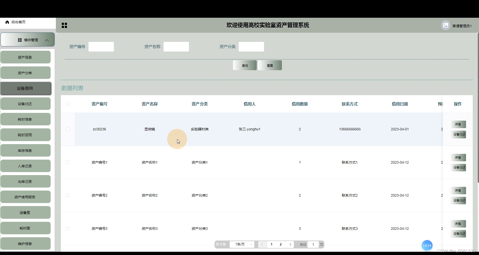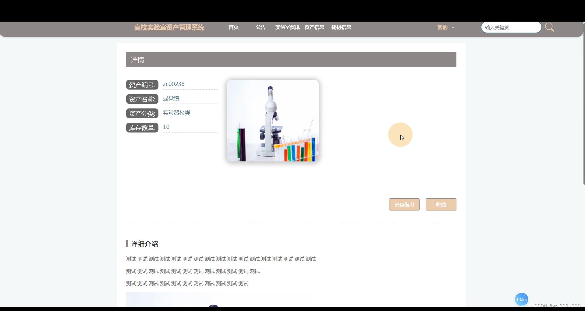 普通用户登录系统,可以查看首页,公告,实验室资讯,资产信息,耗材信息,设备借用,设备归还,耗材领用等信息,如下图所示: