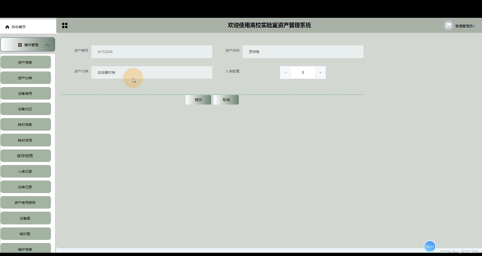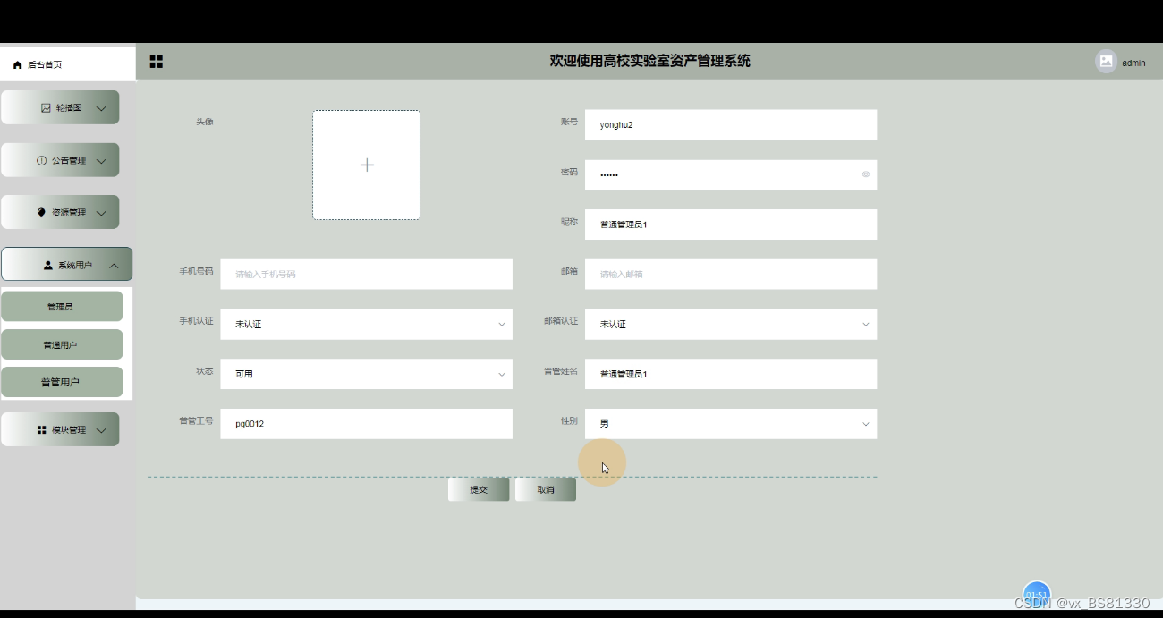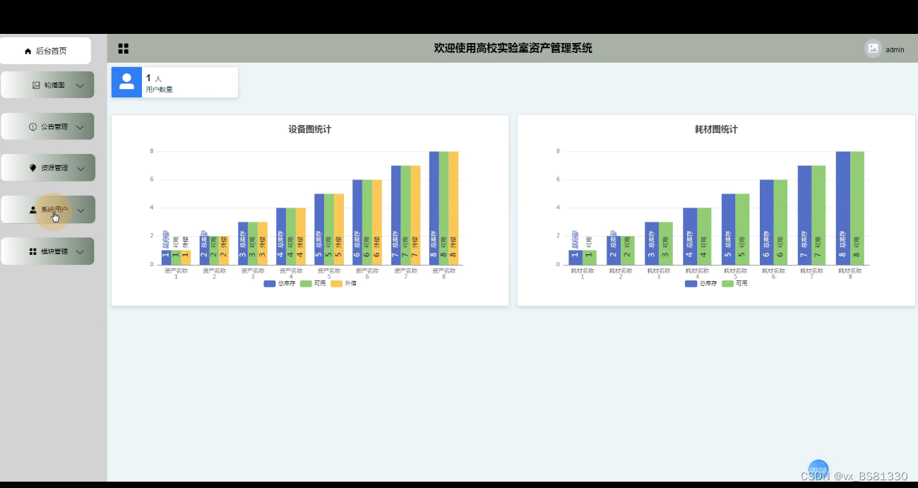 管理员登录高校实验室资产管理系统,有后台首页,轮播图,公告管理,资源管理,系统用户(管理员,普通用户,普管用户),模块管理(资产信息,资产分类,设备借用,设备归还,耗材信息,耗材领用,库存信息,入库记录,出库记录,资产使用报告,设备图,耗材图,维护信息)等功能,如下图所示: