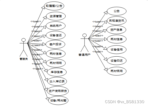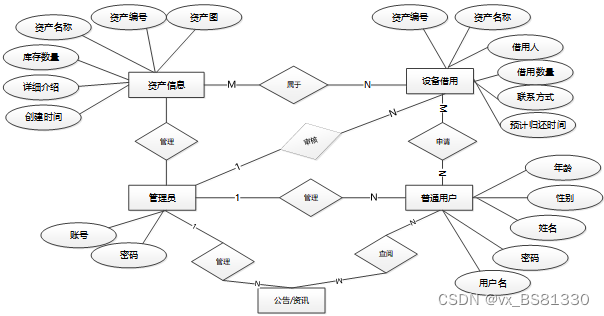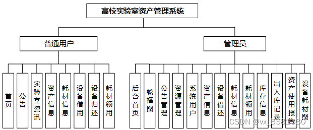 (1)功能要求:首页,轮播图,公告管理,资源管理,系统用户(管理员,普通用户,普管用户),模块管理(资产信息,资产分类,设备借用,设备归还,耗材信息,耗材领用,库存信息,入库记录,出库记录,资产使用报告,设备图,耗材图,维护信息)等功能模块。
