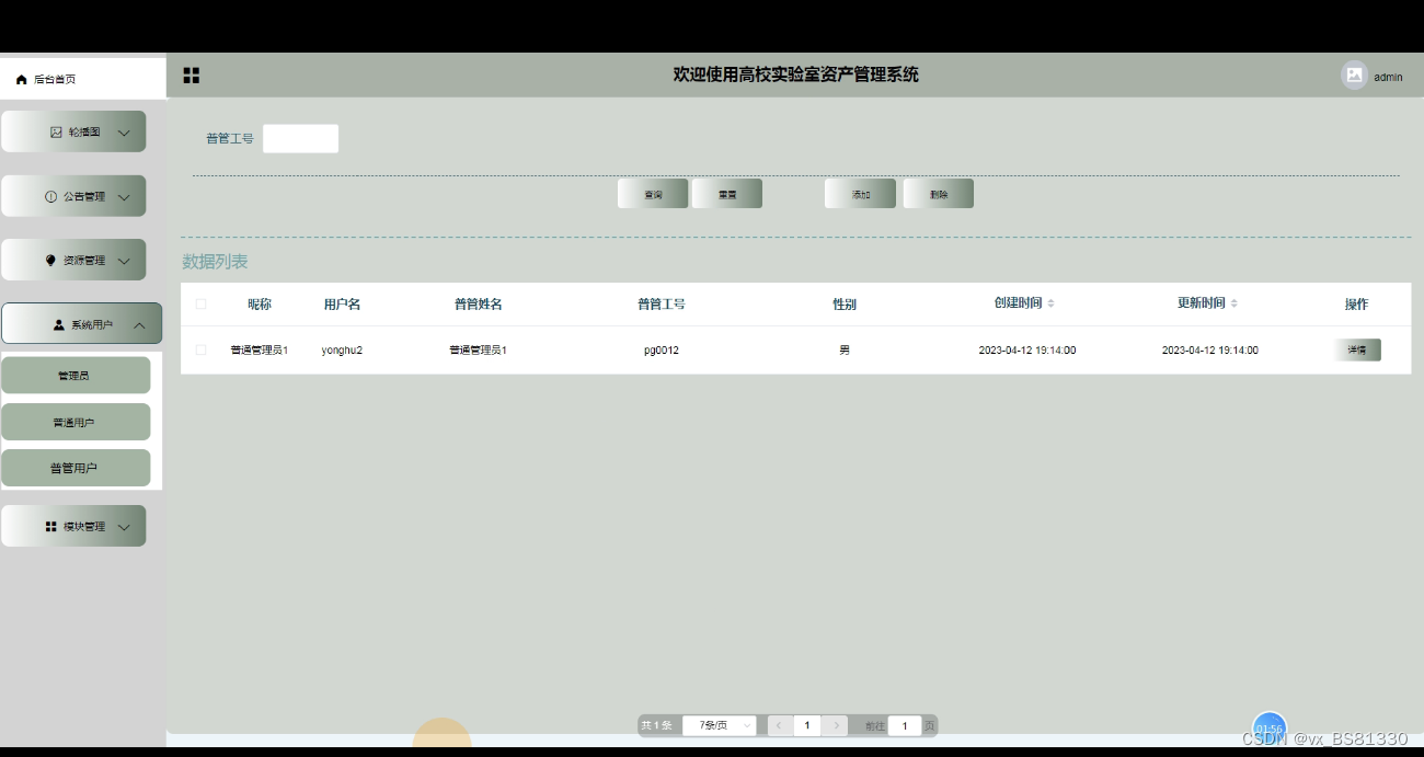 系统用户管理,普通用户及普通管理员无需注册均有管理员添加。在此界面可查看普通用户及普通管理员的用户名,姓名,性别,手机号码,邮箱等信息,还可在此页面进行重置,删除,添加等操作,如图5-4。