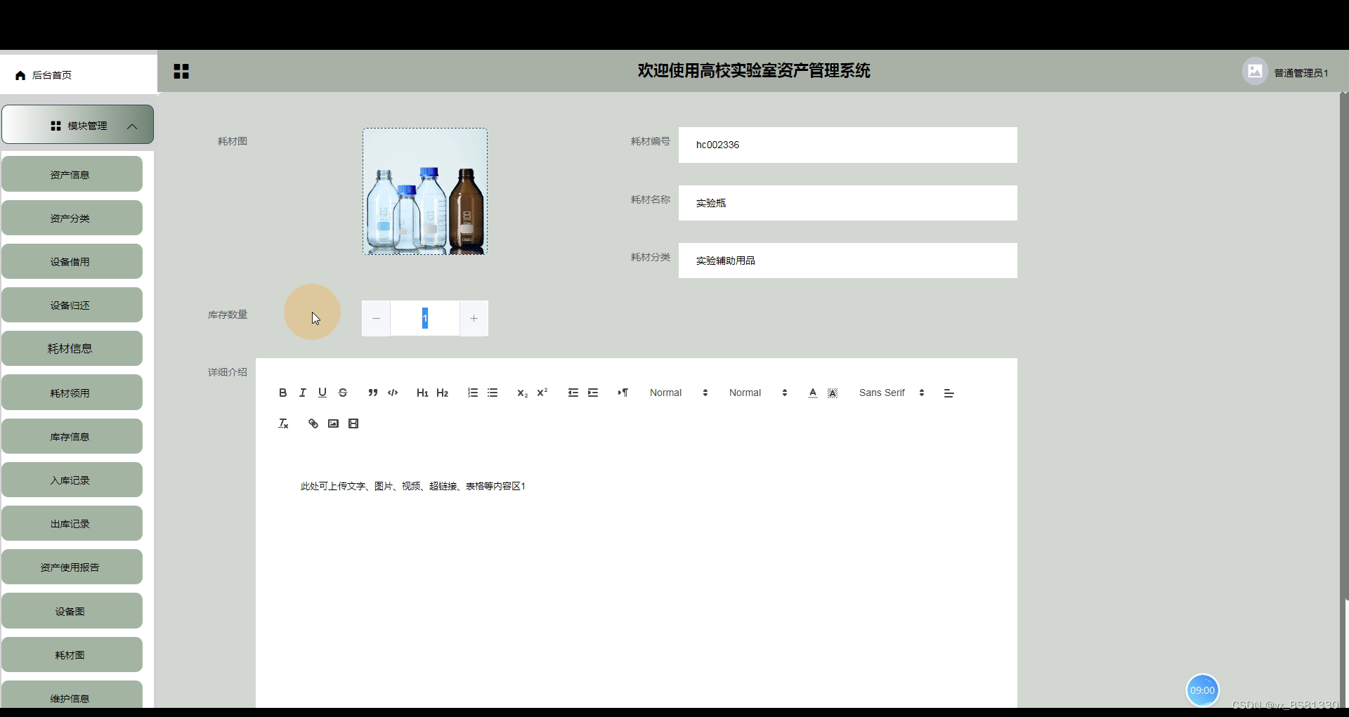 3、功能的完善性:首页,轮播图,公告管理,资源管理,系统用户(管理员,普通用户,普管用户),模块管理(资产信息,资产分类,设备借用,设备归还,耗材信息,耗材领用,库存信息,入库记录,出库记录,资产使用报告,设备图,耗材图,维护信息)等模块的修改维护操作。