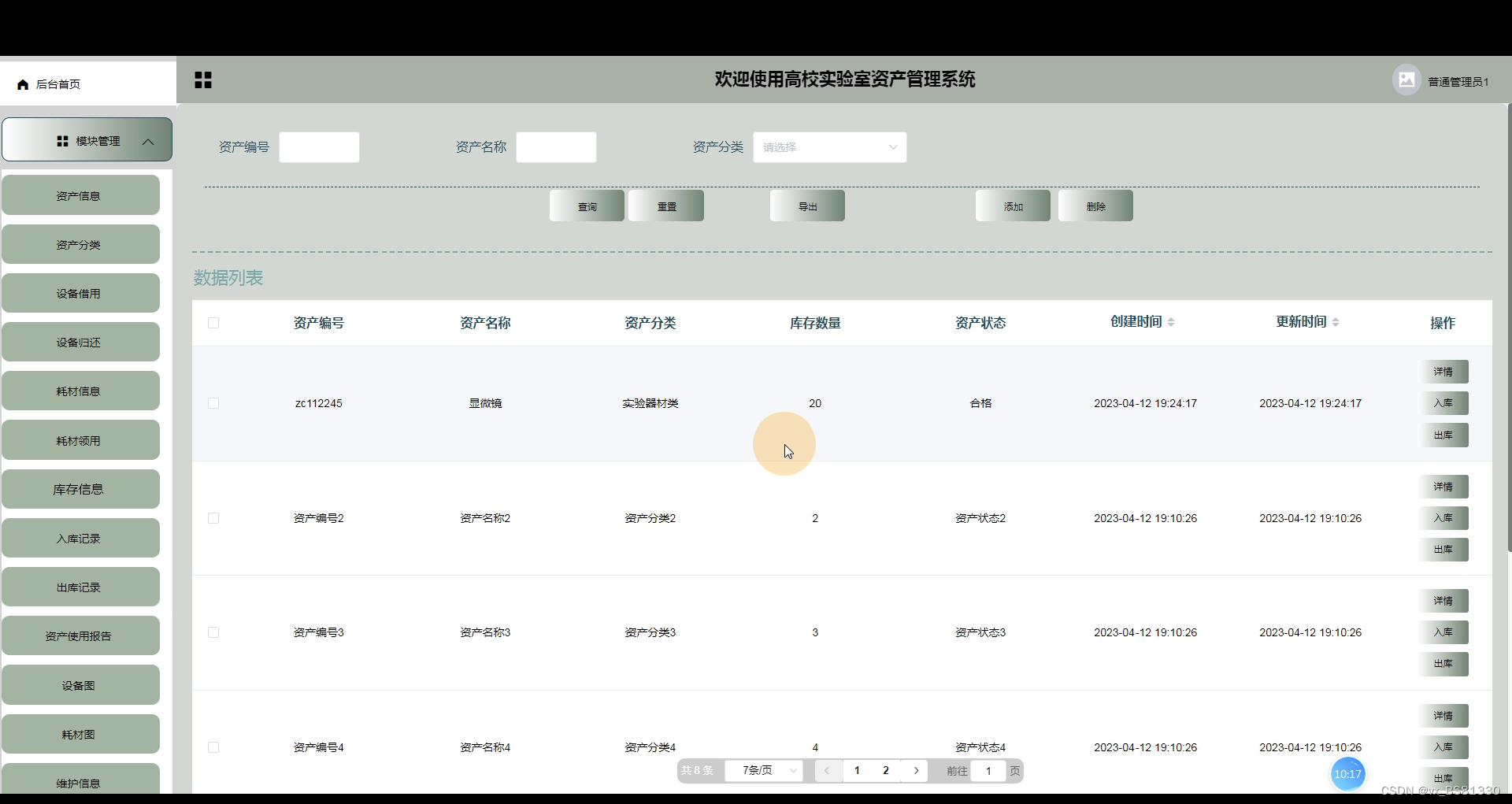 库存信息管理,在此界面可维护管理库存信息,包括包括资产图,资产编号,资产名称,分类,库存数量等信息,还可在此页面进行重置,删除,添加,入库,出库等操作,如下图所示。