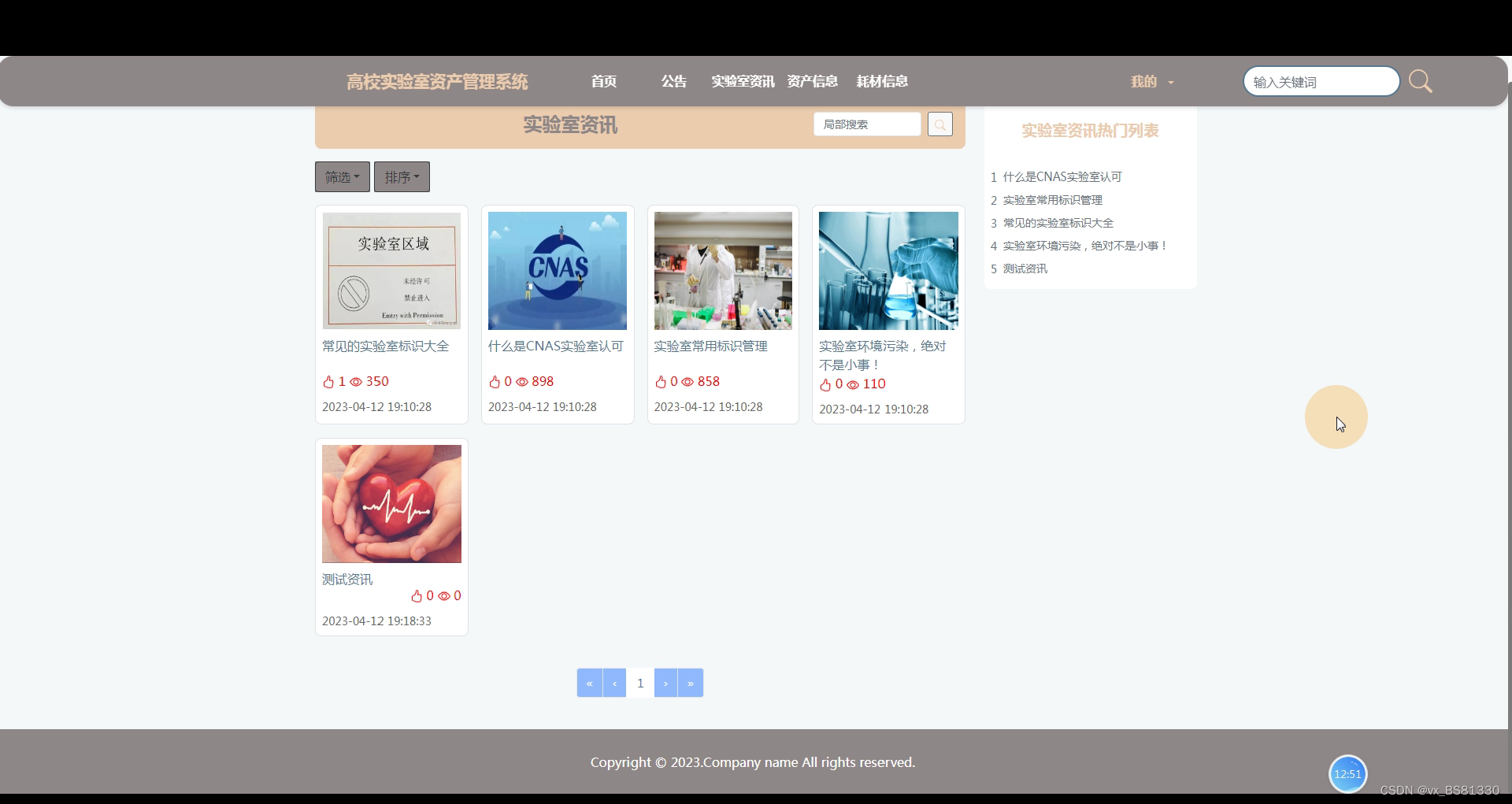 实验室资讯,在此页面可以通过局部搜索,下拉菜单搜索,排序等方式查看资讯,还可在详情页面进行点赞,收藏,评论等操作。如下图所示。