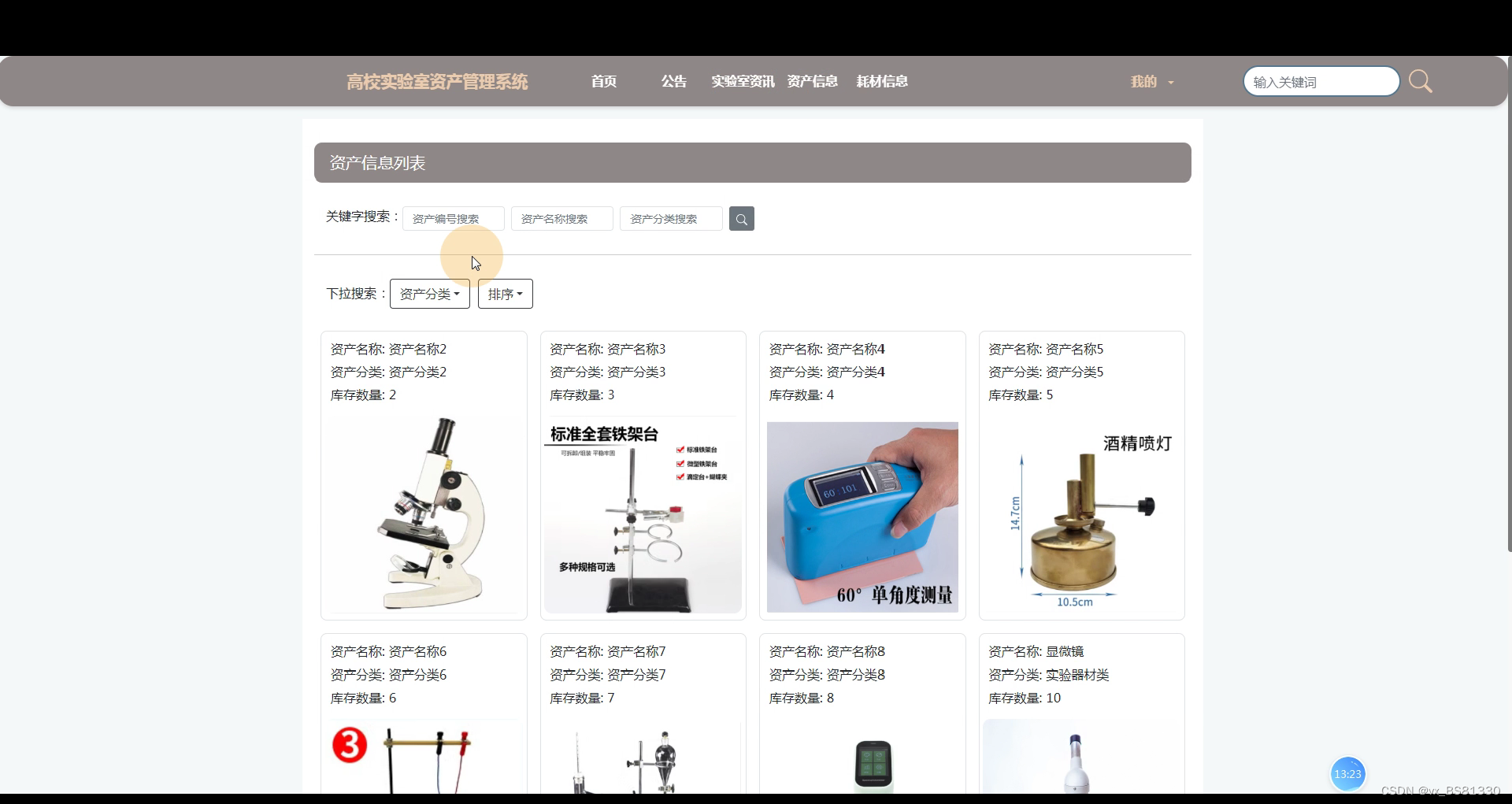 资产信息,在此页面可以通过关键字搜索,下拉菜单搜索,排序等方式查看资产信息,包括资产图,资产编号,资产名称,分类,库存数量等信息,还可在详情页面进行收藏,评论,申请借用等操作。如下图所示。