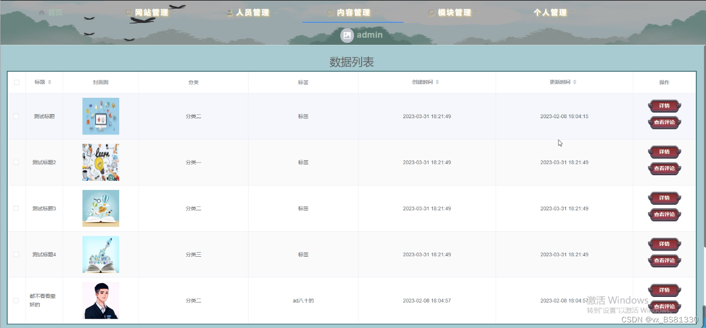 网站帖子管理,在网站帖子管理页面中可以对标题、封面图、分类、标签、描述、昵称等信息进行详情、评论、添加、修改或删除等操作,如图5-9所示。