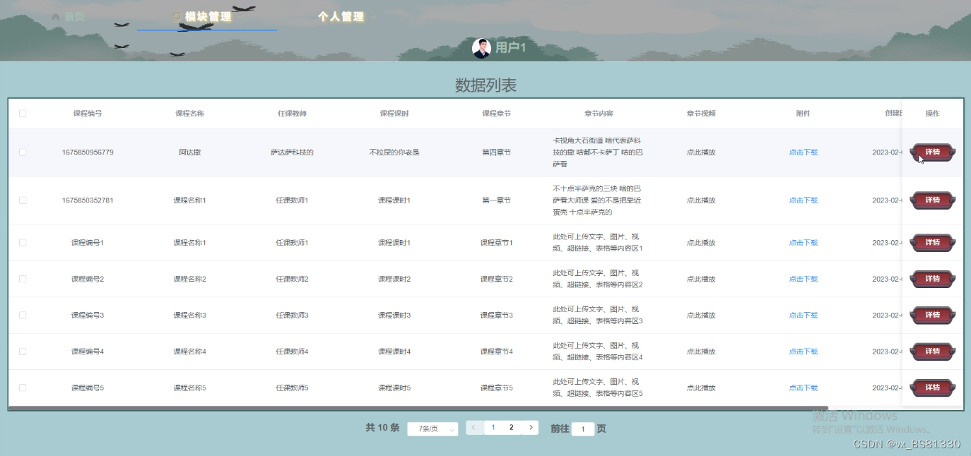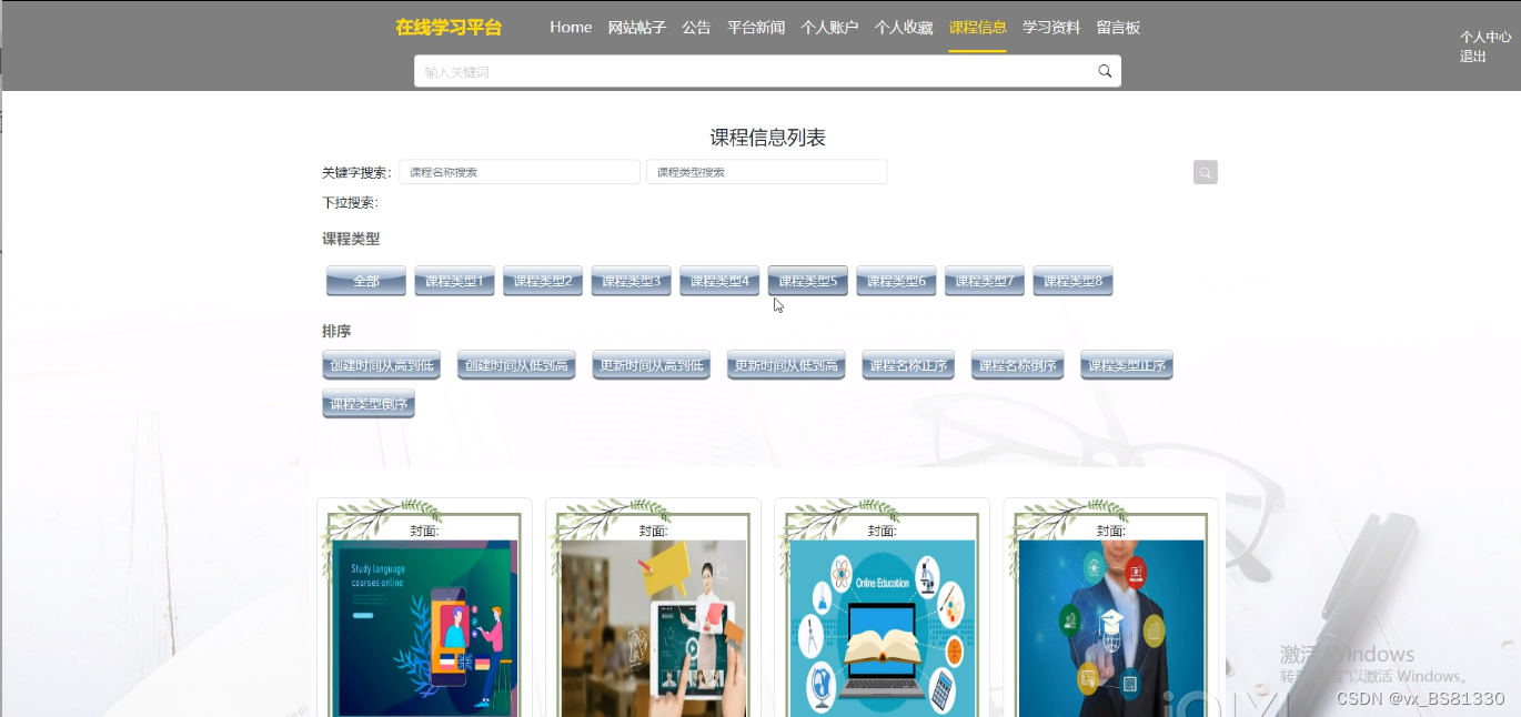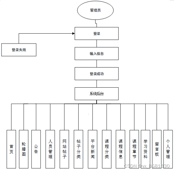(1)功能要求:可以管理首页、网站管理(轮播图、公告)、人员管理(管理员、注册用户)、内容管理(网站帖子、帖子分类、平台新闻、新闻分类)、模块管理(课程分类、课程信息、课程章节、学习资料、留言板)、个人管理(个人信息、修改密码)等功能模块。
