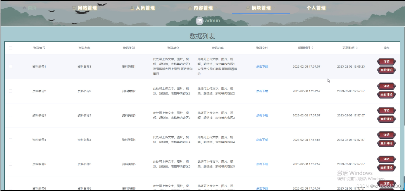 学习资料管理,在学习资料页面中可以对资料编号、资料名称、走了类型、资料简介、资料文件等信息进行详情、评论、添加、修改或删除等操作;如图5-10所示。