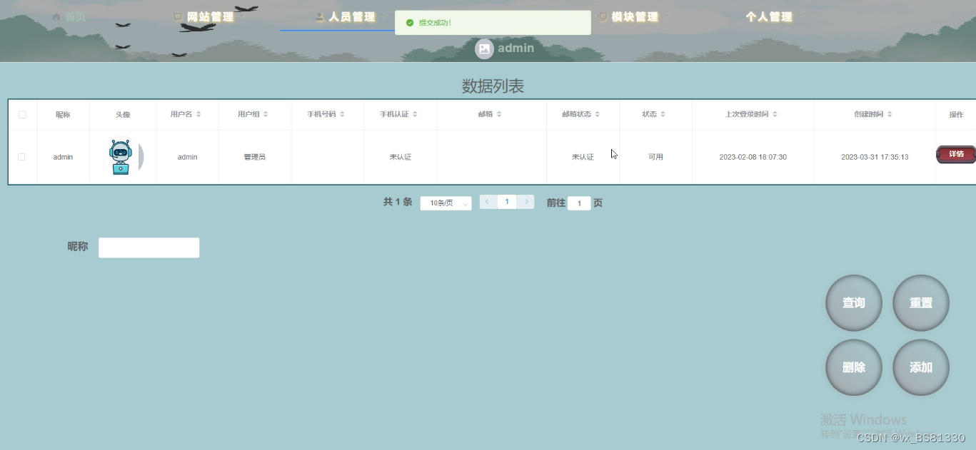 个人管理,在个人管理页面中可以对头像、用户名、昵称、用户组、手机号码、状态、邮箱等信息进行修改或删除等操作;如图5-11所示。