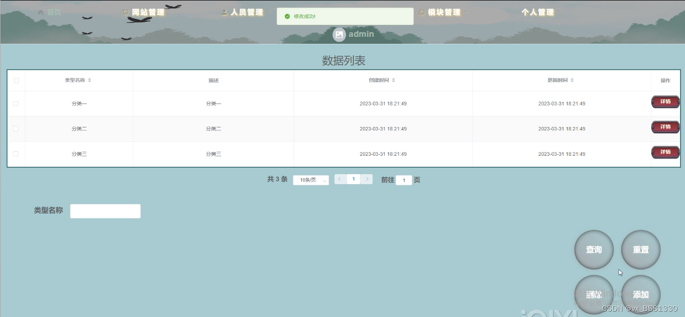 帖子分类管理,在帖子分类管理页面中可以对类型名称、描述等信息,进行详情添加、修改或删除等操作,如图5-8所示。