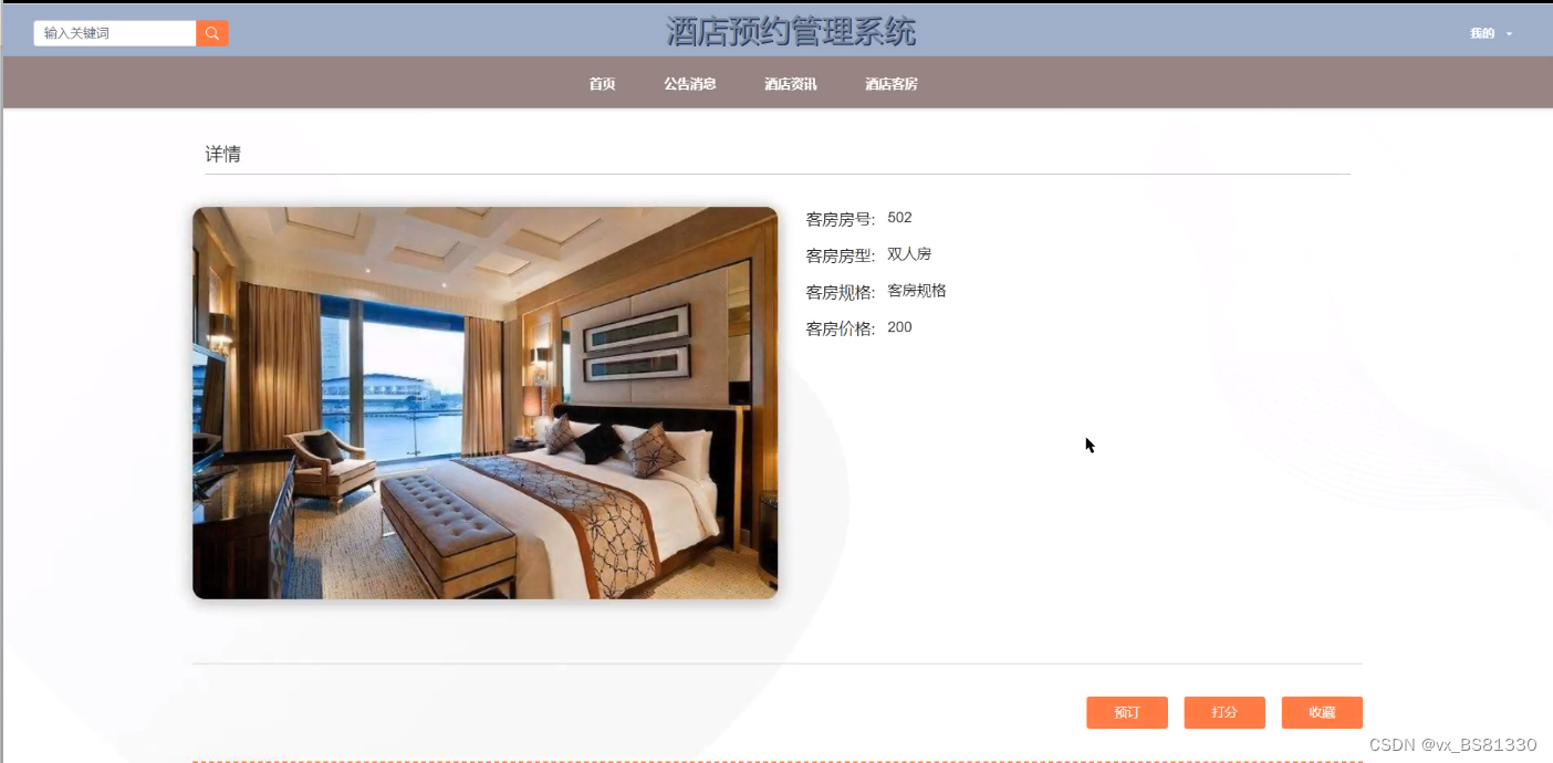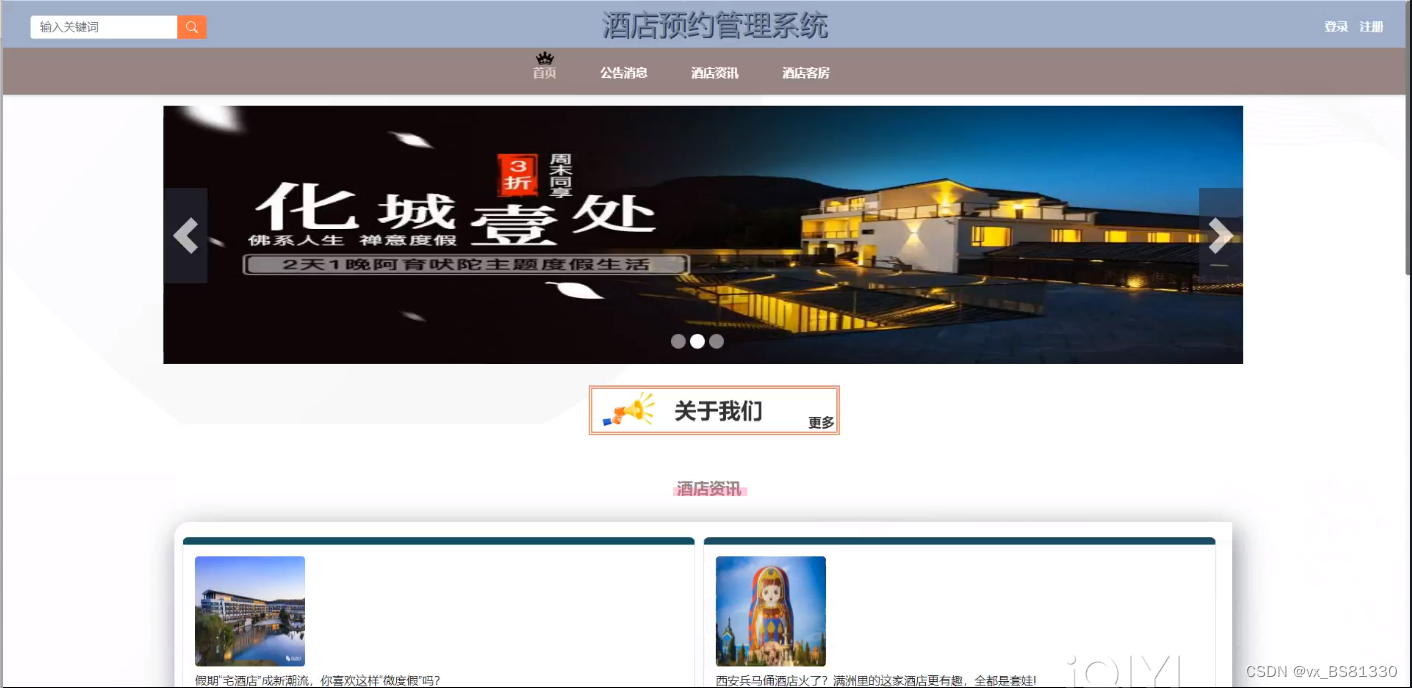 酒店预约管理系统首页功能界面图,功能分为:首页、公告消息、酒店资讯、酒店客房、后台管理;如下图所示: