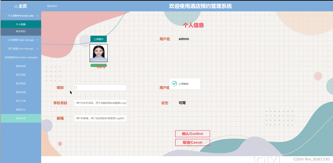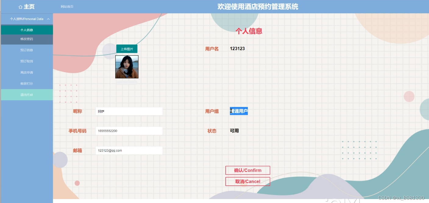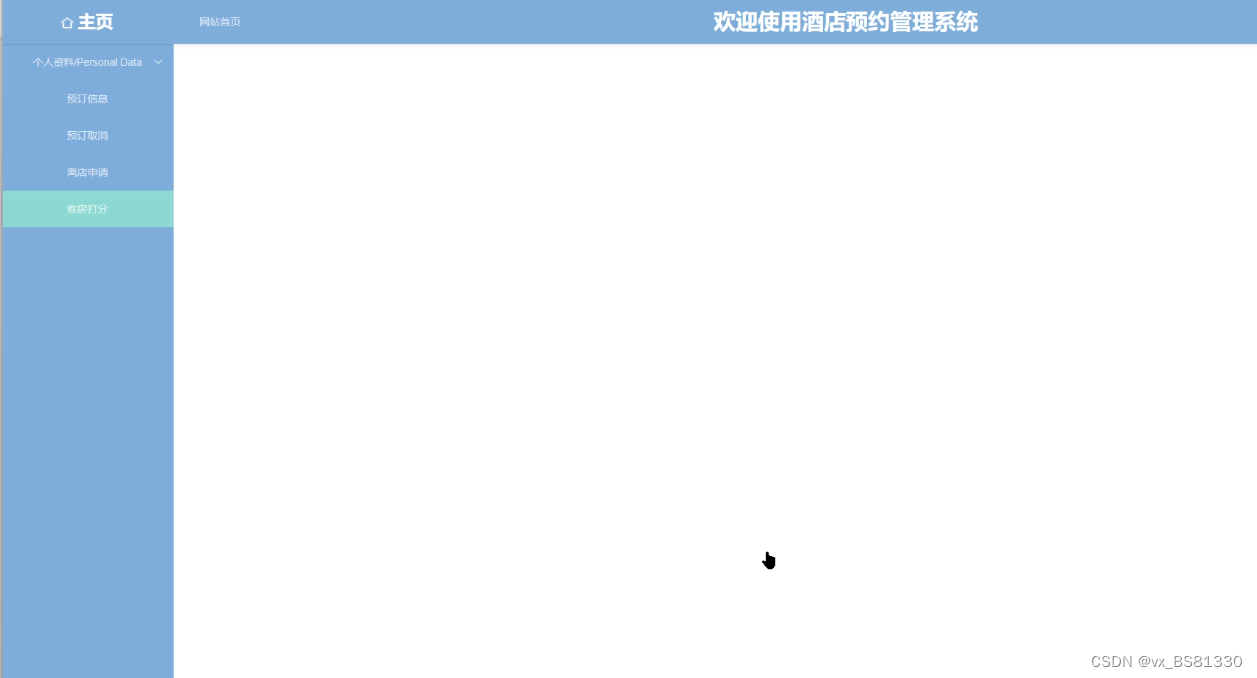 顾客登录进入首页管理可以查看后台首页、个人资料(个人信息、修改密码)、预订信息、预订取消、离店申请、客房打分等内容,如图5-6所示。