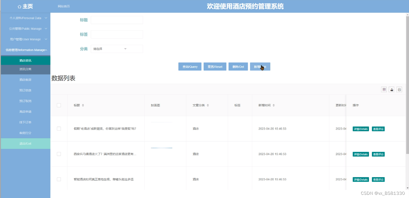 酒店资讯管理,在酒店资讯管理页面可以查看封面图、标签、标题、分类、描述等信息,并可根据需要进行评论、删除、添加详细内容等操作,如图5-5所示。