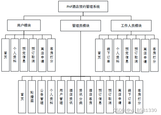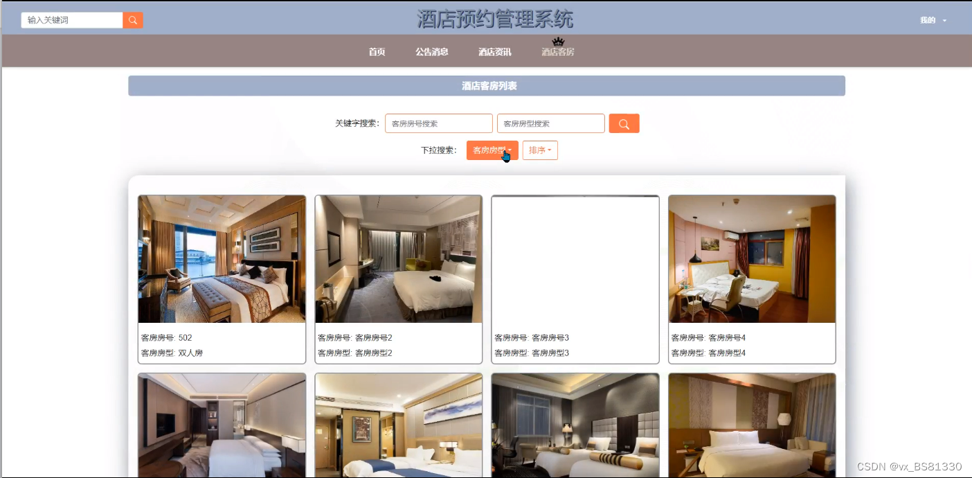 (1)功能要求:可以管理首页、个人资料(个人信息、修改密码)、公告管理(轮播图、公告消息)、用户管理(管理员、工作人员、普通用户)、信息管理(酒店资讯、资讯分类)、酒店客房、预定信息、预定取消、离店申请、线下订单、客房打分等功能模块。