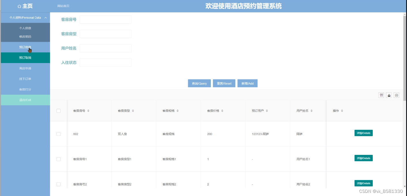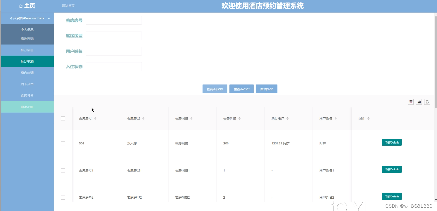 预订取消管理,在预订取消管理页面可以客房房号、客房房型、客房规格、客房价格、预订用户、用户姓名等信息,还可在该页面进行查询、编辑删除详情等操作,如图5-12所示: