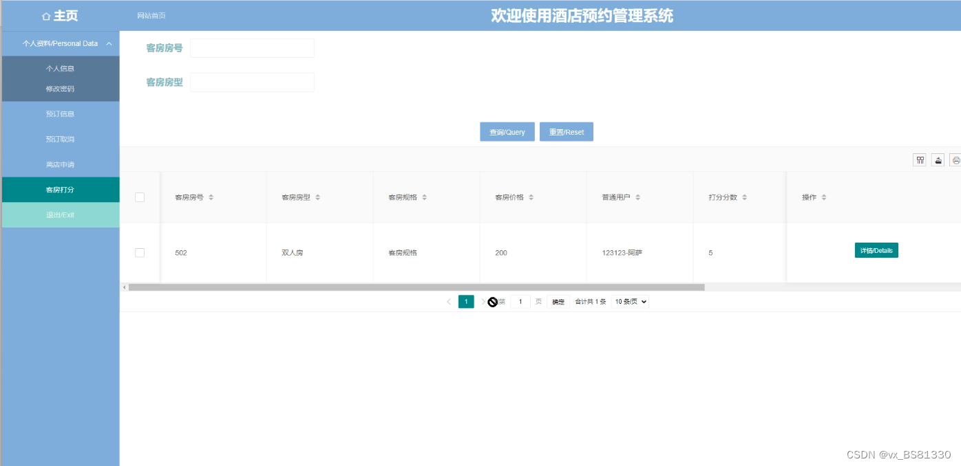 客房打分,在此页面查看客房房号、客房房型、客房规格、客房价格、普通用户、打分分数等信息,还可根据需要在对该页面进行打查询、添加、删除操作 图5-10所示。