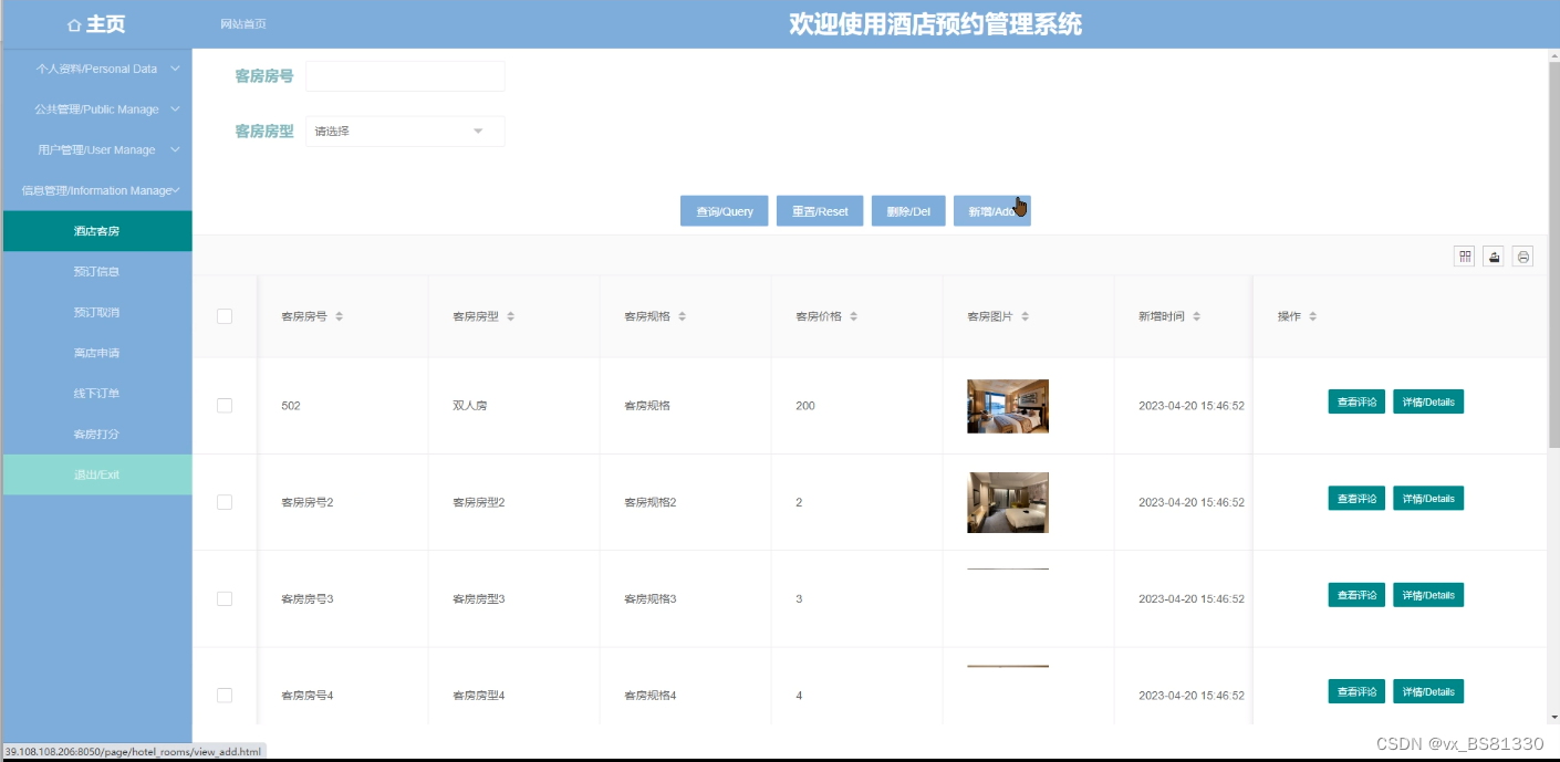 酒店客房管理,在酒店客房管理添加页面可以查看到客房房号、客房规格、客房房型、客房价格、客房简介、图片等信息,并可根据需要进行查询,查看评论,删除或查看详细内容等操作,如图5-3所示。
