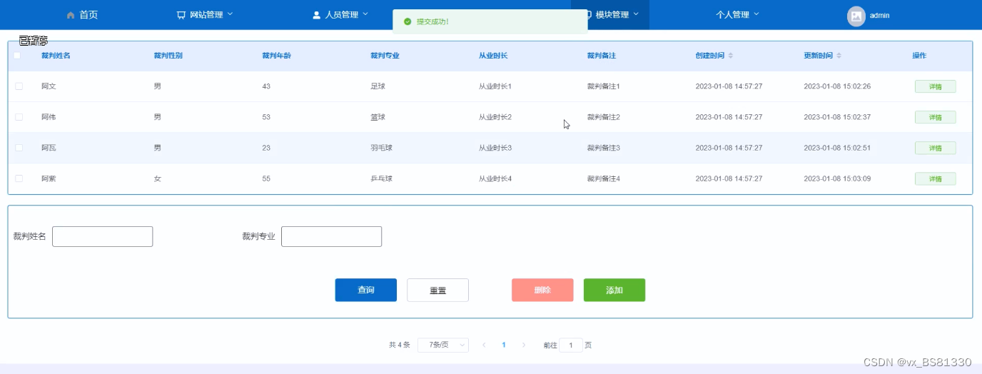 管理员执行裁判信息管理,并可以操作相关内容,例如添加,查看,编辑和删除。通过单击“添加裁判信息”,可以通过裁判信息添加界面添加详细信息。单击查看字段级别链接以查看有关所选字段级别的信息。然后单击“提交”跳转重返到添加页面。添加成功后的信息会载入到裁判信息查询列表中,管理员可进行编辑以及修改。