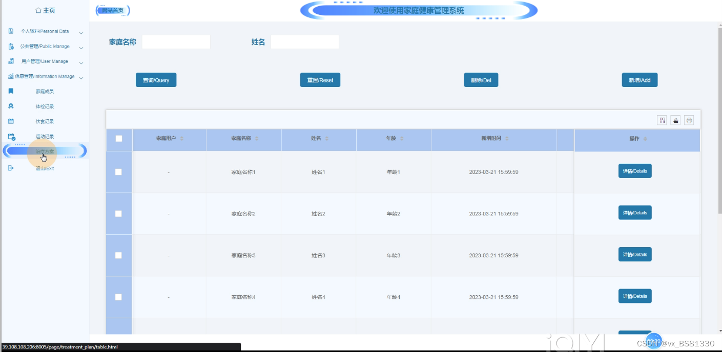 体检记录管理,在体检记录管理可以查看:家庭用户、家庭名称、姓名、年龄、体检时间、健康状况等信息,进行治疗方案、添加、删除等操作,如图5-5所示。
