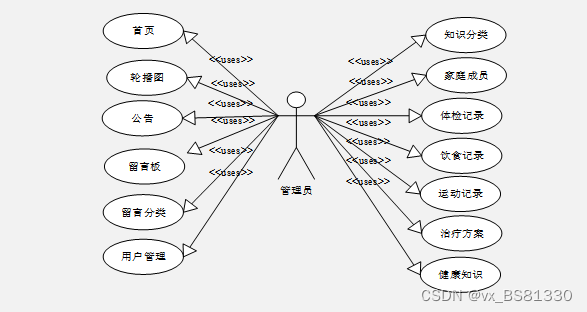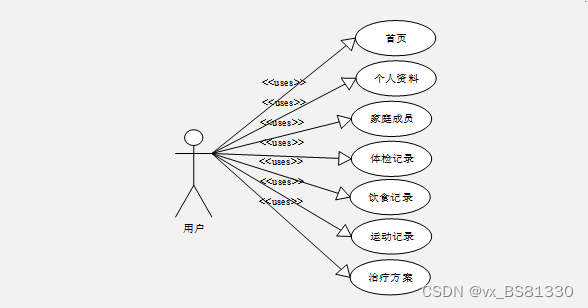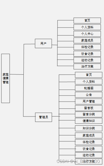 SSM家庭健康管理系统的设计基于安卓手机上运行,可以实现管理员服务端首页、个人资料(个人信息、修改密码)、公共管理(轮播图、公告)、用户管理(管理员、家庭用户)、信息管理(留言板、留言分类、健康知识、知识分类)、家庭成员、体检记录、饮食记录、运动记录、治疗方案等功能。同时也方便用户客户端:首页、个人资料(个人信息、修改密码)、家庭成员、体检记录、饮食记录、运动记录、治疗方案详细的了解。根据系统功能需求建立的模块关系图如下图: