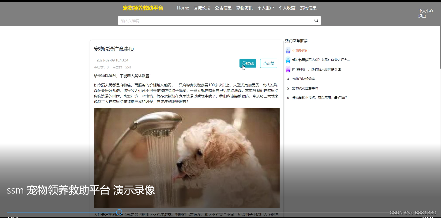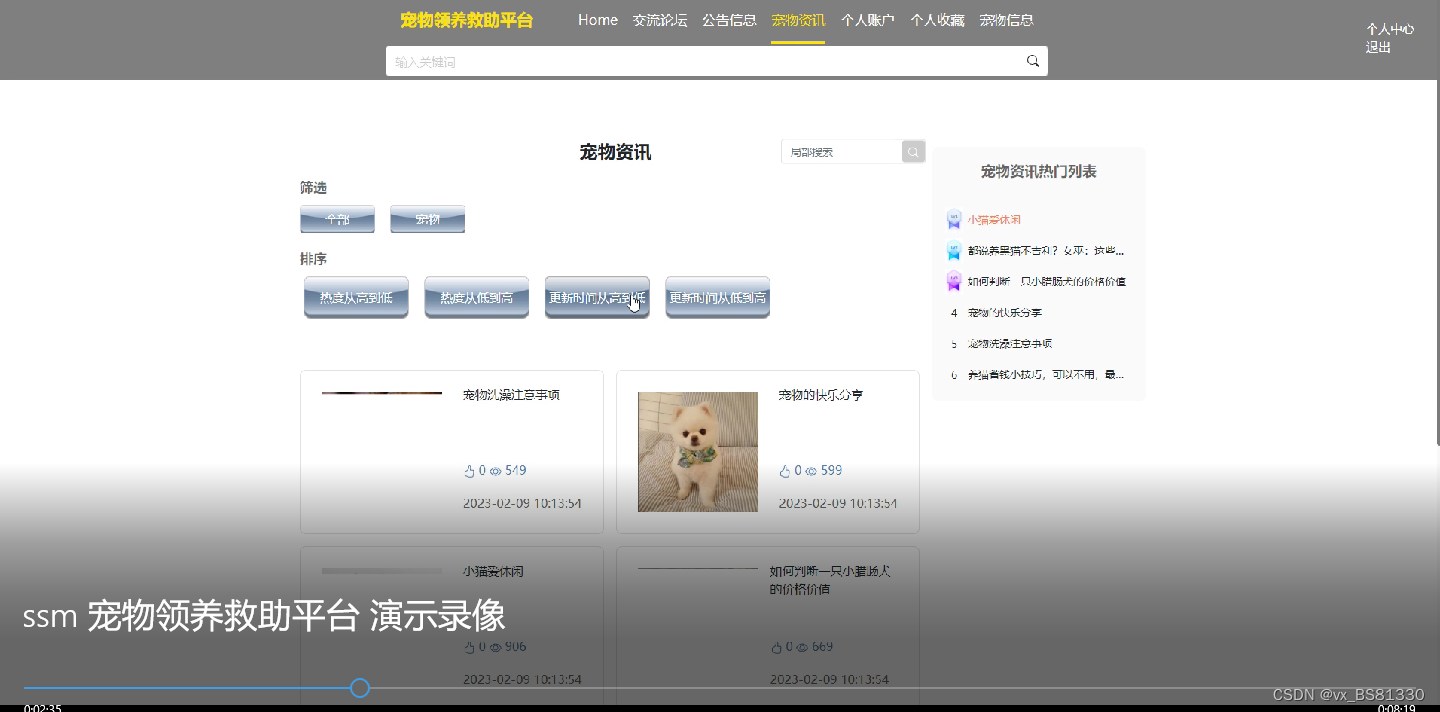 宠物资讯,在此页面可以查看推荐的资讯信息,并通过筛选,排序等操作进行资讯信息查询,进入资讯详情界面后可以进行收藏,点赞,评论等操作,如图5-13,5-14所示。