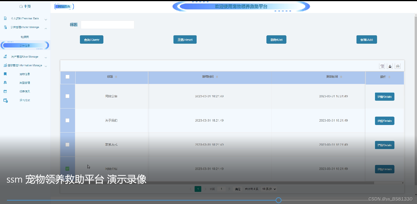 公告信息,管理员在此页面可以查看公告标题,新增时间,更新时间等信息,并可根据需要进行查询,重置,删除,新增等操作,如图5-4所示。