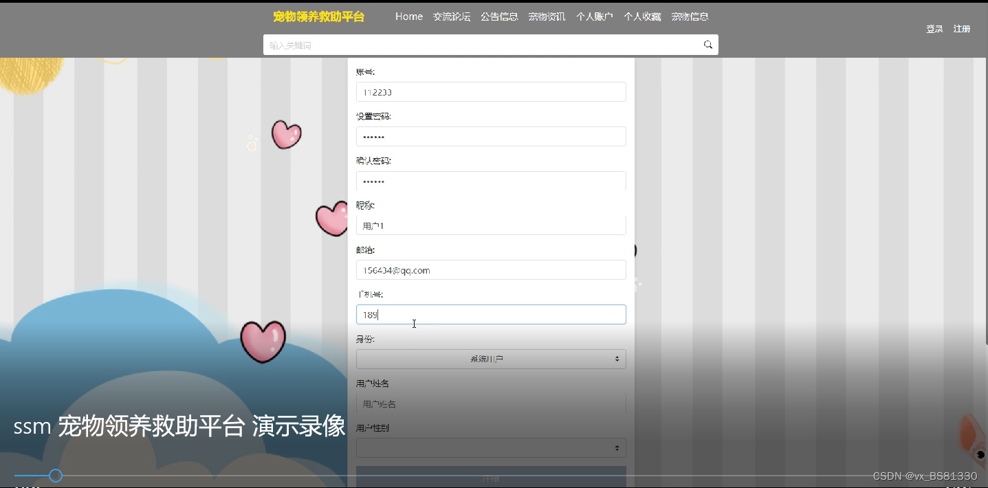 用户注册,通过填写账号、密码、昵称、邮箱等信息,输入完成后选择登录即可进入宠物领养救助平台,如图5-10、5-11所示。
