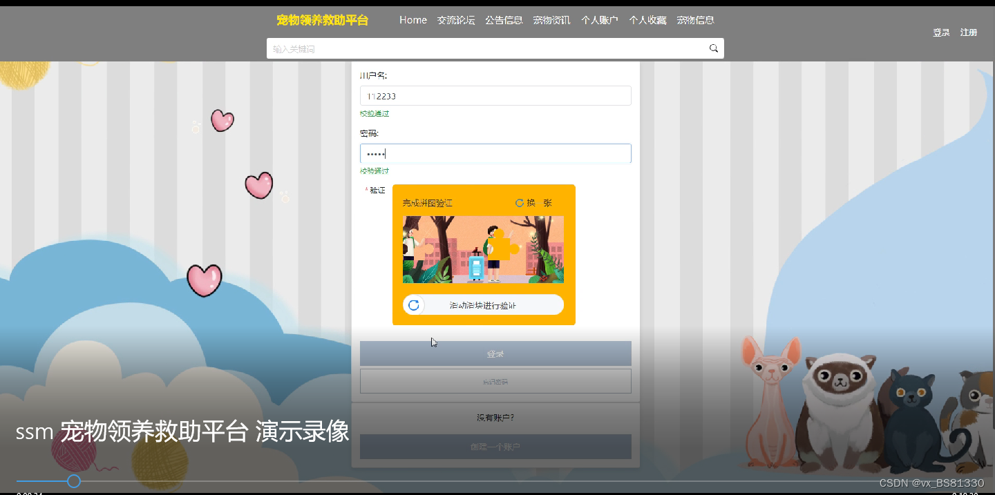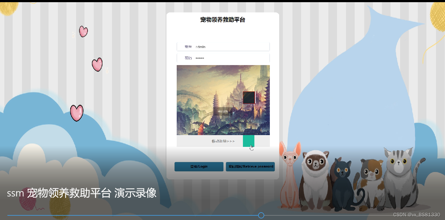 管理员登录,通过填写账号、密码、完成行为验证后登录即可进入宠物领养救助平台,如图5-1所示。