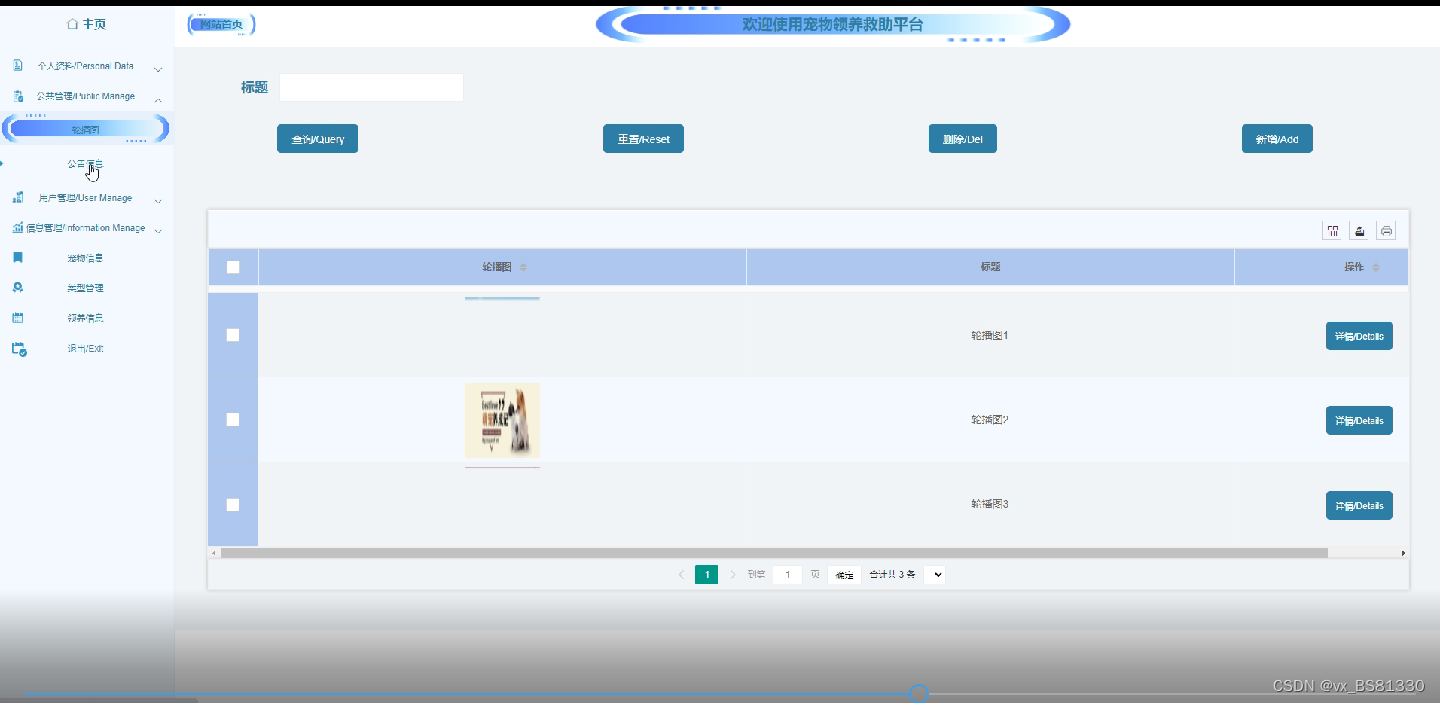 轮播图管理,在此页面可以查看轮播图封面图,标题等信息,并可根据需要进行查询,重置,删除,新增等操作,如图5-3所示。