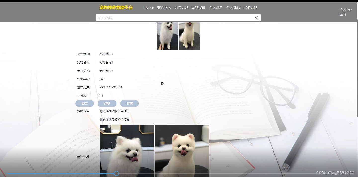 宠物信息,在此页面可以查看宠物信息,并通过关键词搜索,宠物类型排序等操作进入宠物信息详情,进入宠物信息详情界面后可以看到宠物编号、宠物名称、宠物类型、宠物年龄、发布用户、点赞数、宠物位置、宠物介绍等详细信息,并可进行收藏,点赞,评论、领养等操作。如图5-15,5-16所示。