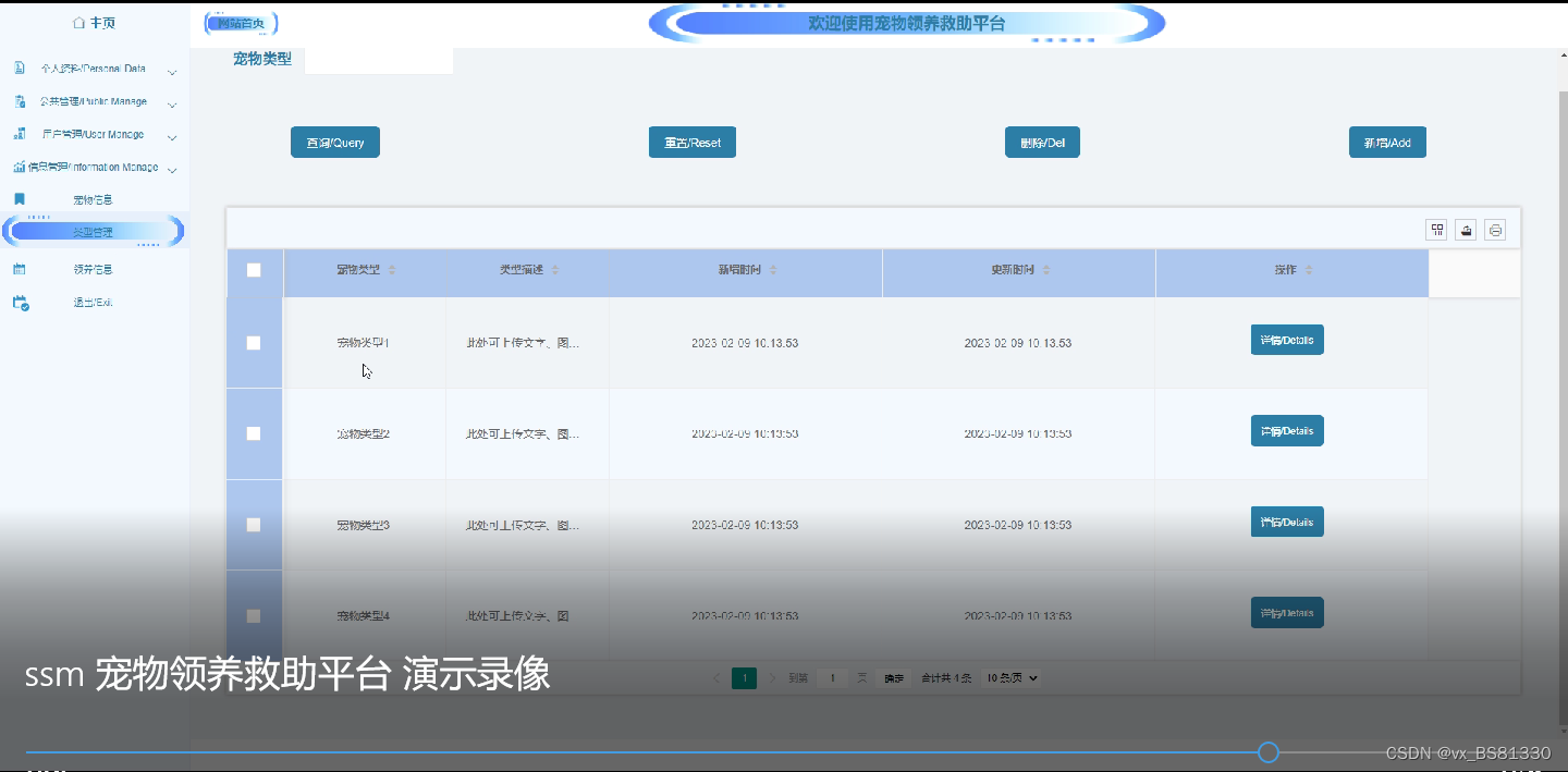 类型管理,管理员在此页面可以查看标题,封面图,宠物类型、类型描述、更新时间等信息,并可根据需要进行查询,重置,删除,新增等操作,如图5-7,5-8所示。