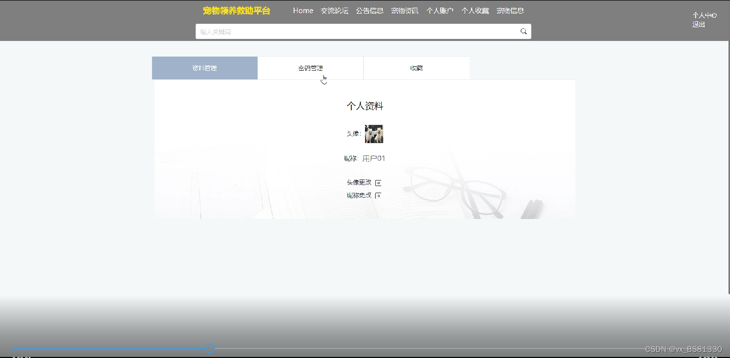 3、功能的完善性:可以管理后台首页,个人信息公共管理(轮播图,公告信息),用户管理(管理员,系统用户),信息管理(交流论坛、论坛分类、宠物资讯、宠物信息、类型管理、领养信息)等功能模块的修改维护操作。