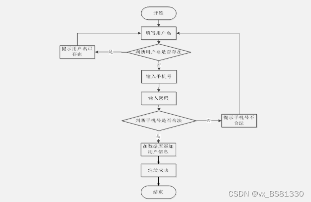 未注册用户可进入注册界面,填写用户信息,若用户名存在的话,提示返回填写用户名,用户名不存在,则填写密码和手机号,如果电话号码是有效的,用户信息被添加到数据库,注册成功。用户注册流程图如图3.2所示。