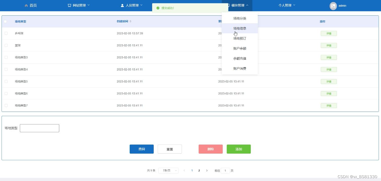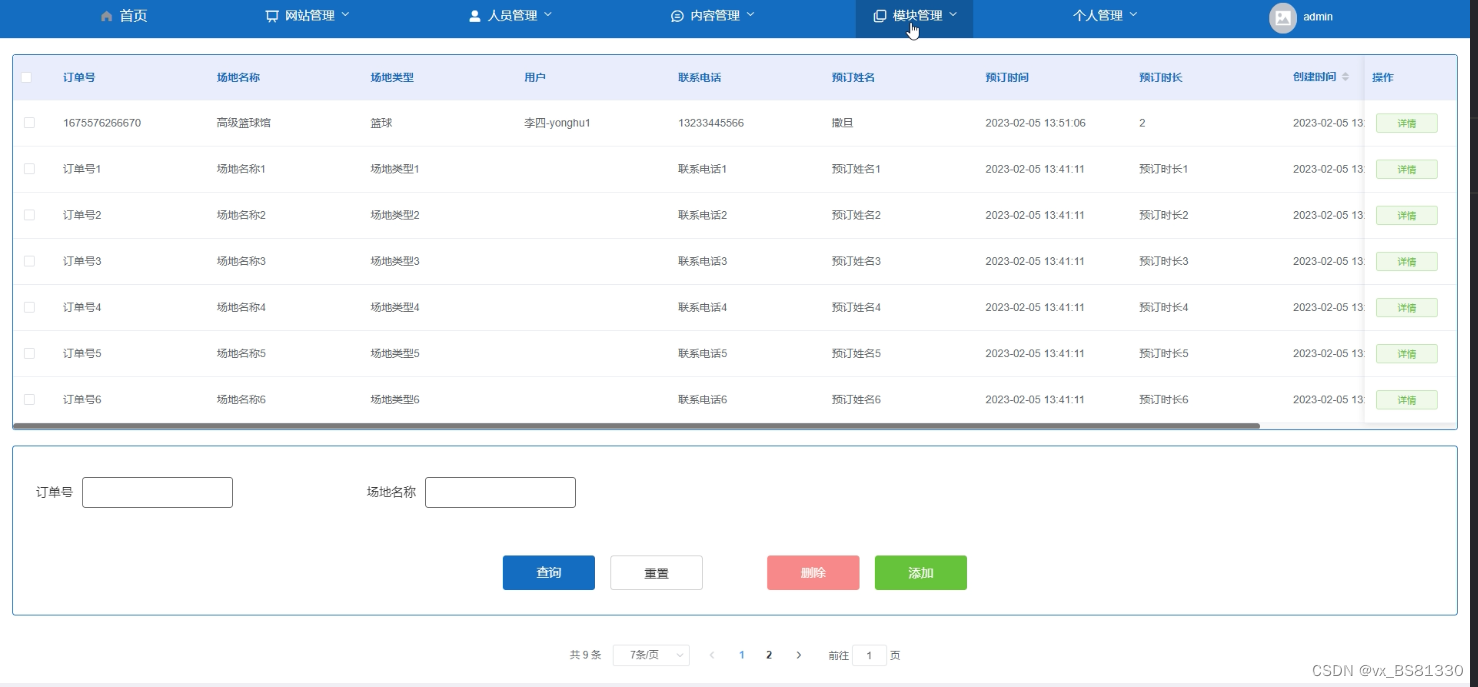 场地预订管理:通过场地预订可以获取索引、订单号、场地名称、场地类型、用户、联系电话、预订姓名、预订时间、预订时长等信息,进行详情、修改、删除操作,如图5-6所示;