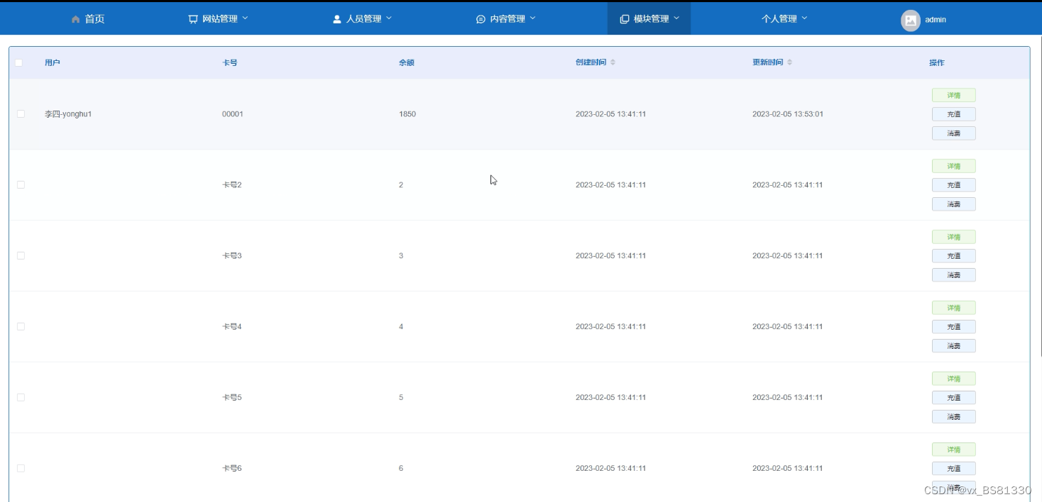 账户余额:通过内容列表可以获取用户、卡号、余额详情、充值、消费操作,如图5-7所示;