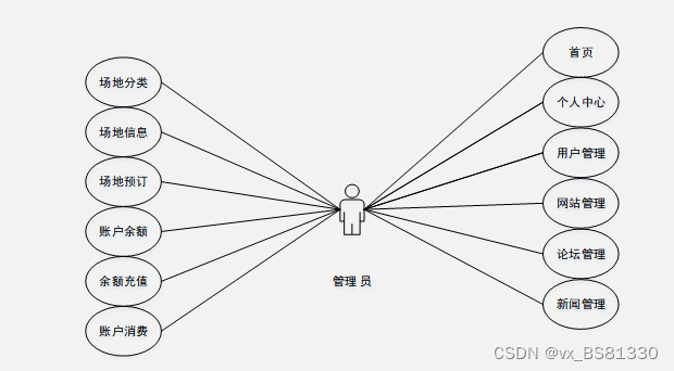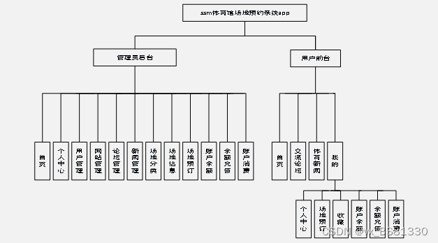 管理员后台;首页、网站管理(轮播图、公告通知)人员管理(管理员、注册用户)内容管理(交流论坛、论坛分类、体育新闻、新闻分类)模块管理(场地分类、场地信息、场地预订、账户余额、余额充值、账户消费)个人管理,用户前台;首页、交流论坛、体育新闻、我的(个人中心、收藏)场地预订、账户余额、余额充值、账户消费等。