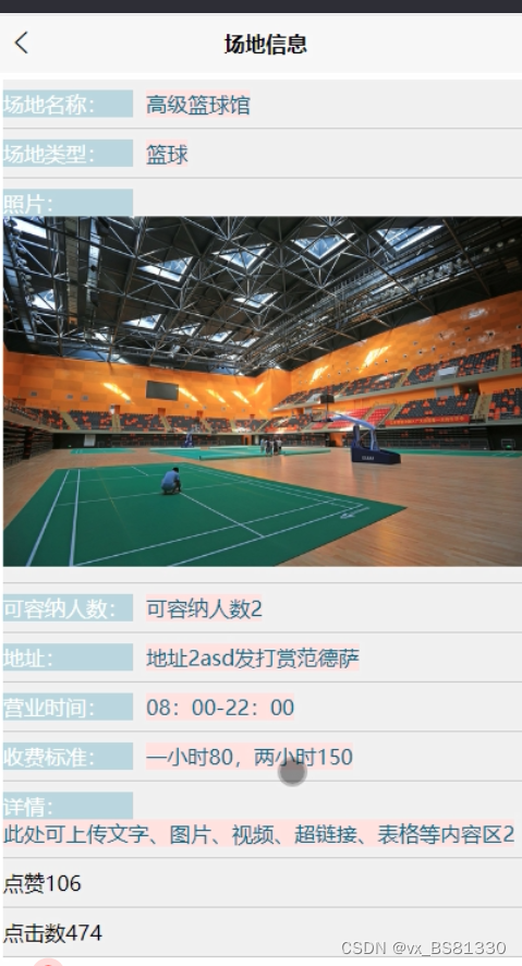 在场地信息页面可以查看场地名称、场地类型、照片、可容纳人数、地址、营业时间、收费标准、详情等信息,并可根据需要进行预订、收藏等操作,如图5.11所示。