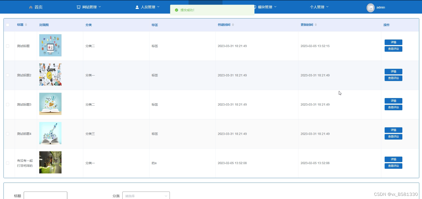 交流论坛管理:通过交流论坛列表可以获取标题、封面、分类、标签、创建时间等进行详情或修改、删除操作,如图5-4所示;