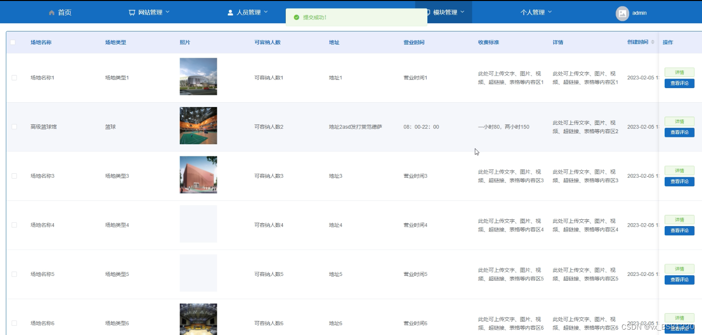 场地信息:通过场地信息可以获取索场地名称、场地类型、照片、可容纳人数、地址、营业时间、收费标准、详情等信息,进行查看评论、回复、删除操作,如图5-5所示;