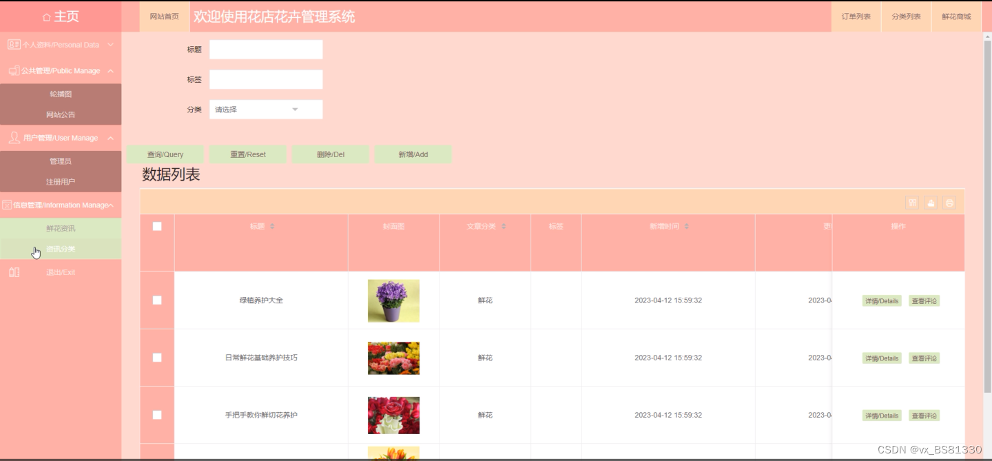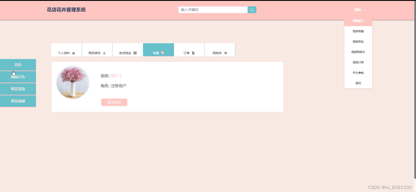 管理员功能模块包括:主页、个人资料(个人信息、修改密码)公共管理(轮播图、网站公告)、信息管理(鲜花资讯、资讯分类)、鲜花商城、分类列表、订单列表、用户管理(管理员、注册用户)等模块。