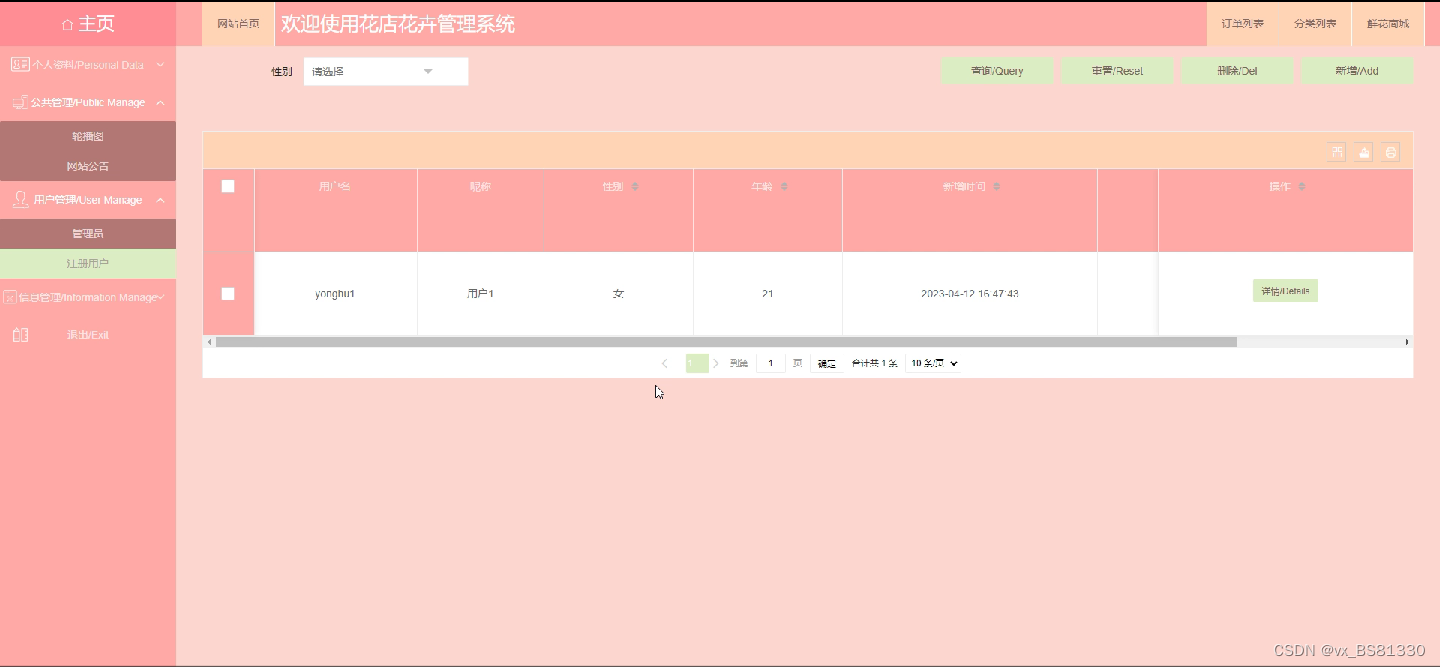 该系统具有主页、个人资料(个人信息、修改密码)公共管理(轮播图、网站公告)、信息管理(鲜花资讯、资讯分类)、鲜花商城、分类列表、订单列表、用户管理(管理员、注册用户)等功能。首先在该系统中用户可以通过本网站的公告信息和商城管理功能进行查看,商品进行全方位了解,可以毫无顾虑的进行购买。其次用户注册登陆本网站后,用户可以进行管理首页、网站公告、鲜花资讯、鲜花商城、我的等功能。最后在主页页面,增加了推送功能,使用户可以直接快速接触到最丰富的内容,提高了用户体验感,增加了销售量。