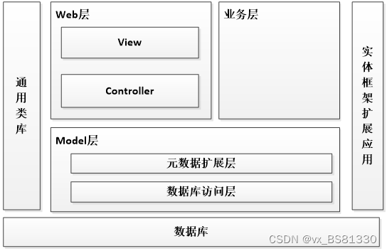 本物业管理系统的架构设计主要分为可以3层,主要有Web层,业务层,Model层。其中web层还包括View层和Controller层,Model层包括元数据扩展层和数据访问层。