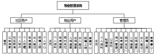 物业管理系统总体分为社区用户模块,物业用户模块和管理员模块。