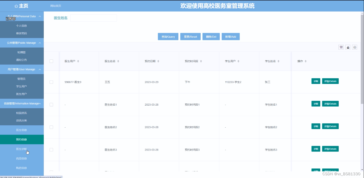 This design mainly implements a college infirmary management system that integrates the advantages of humanization, efficiency, and convenience, and completes functional modules such as home page, doctor information, appointment information, doctor diagnosis, drug information, drug purchase information, and student consultation. The system communicates with the server through a browser to achieve data interaction and change. This system improves work efficiency and reduces errors and omissions in data storage through scientific management methods and convenient services. The university infirmary management system uses Java language, uses spring boot technology based on MVVM mode for development, and uses Eclipse 2017 CI 10 compiler for writing. In terms of data, it mainly uses Microsoft's MySQL database as the data storage medium, and cooperates with front-end Java+CSS technology to complete the system development.