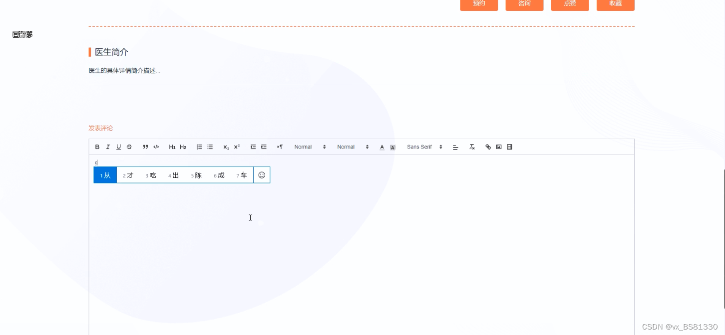 在本次高校医务室管理系统中,利用了目前市场上普遍使用的Java技术,以及数据库管理功能MySQL,和目前比较流行的springboot框架,最后配合使用到了VUE页面布局技术进行系统界面的布置,以现实生活的用户运动过程为标准,设计实现了公告查询、资讯浏览、医生信息查询、药品信息、点赞收藏、在线评论等功能,并维护好后台的信息和整体系统的稳定性。