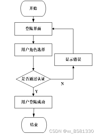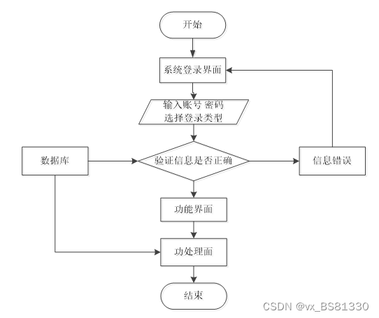 用户想进入系统,首先进入系统登录界面,通过正确的用户名、密码,选择登录类型登录,系统会检查登录信息,信息正确,然后输入相应的功能界面,提示信息错误,登录失败。系统操作流程如图3-4所示。